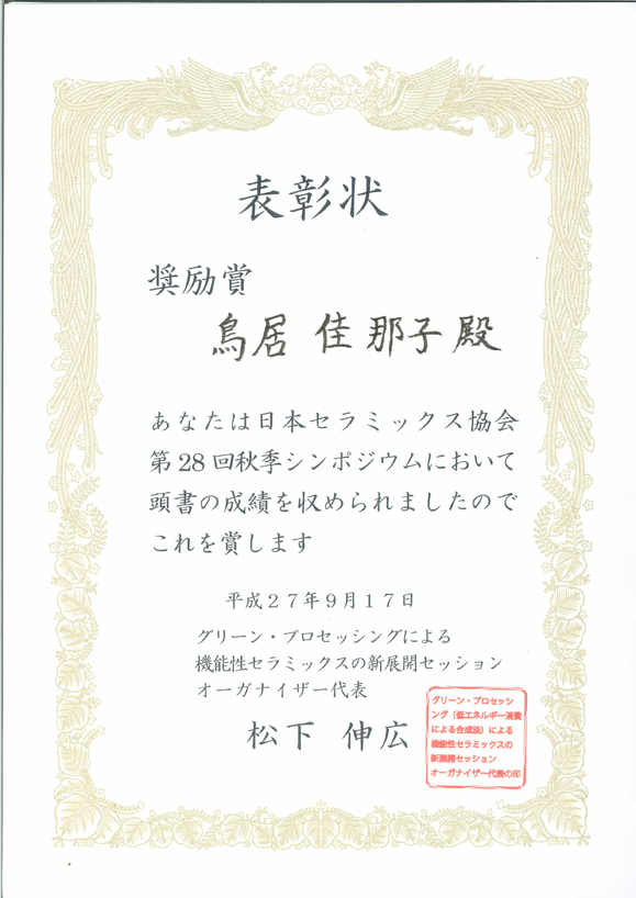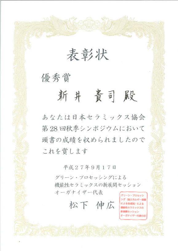 日本セラミックス協会第28回秋季シンポジウムにおいて、鈴木脇谷研究室の新井 貴司君(博士課程2年)が優秀賞を、 鳥居佳那子さん(鈴木脇谷研究室・修士課程2年) が奨励賞を受賞しました。