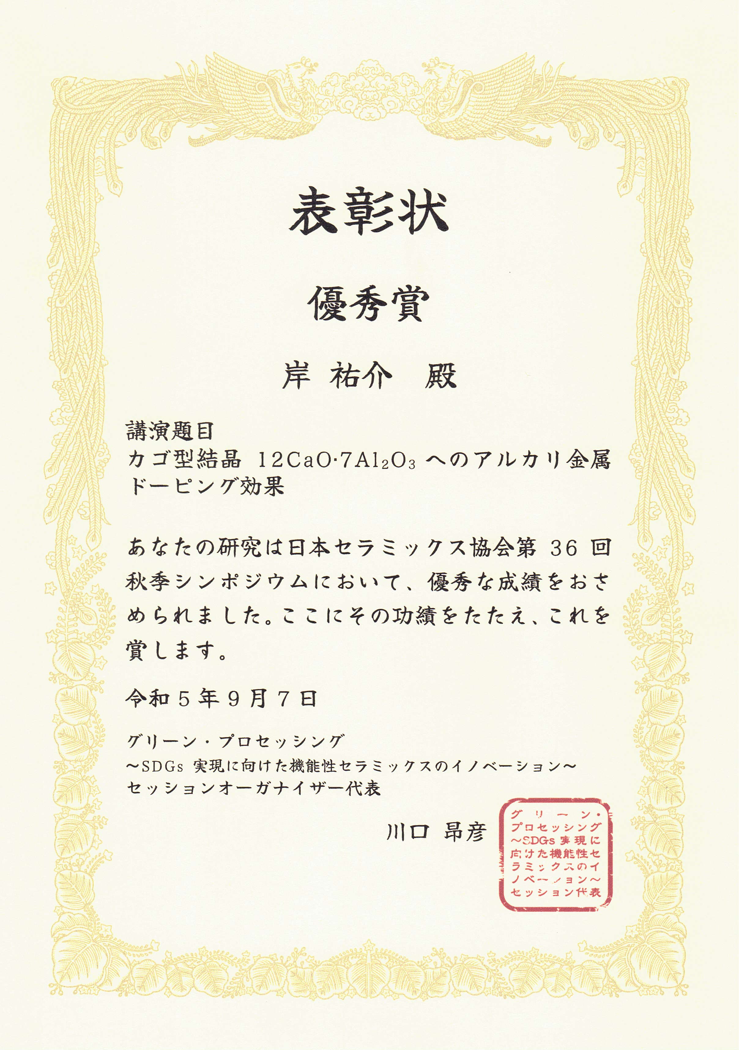 日本セラミックス協会第36回秋季シンポジウムにおいて、電子物質科学コースの脇谷坂元川口研究室から2人の学生が受賞しました。・総合科学技術研究科 工学専攻 修士課程2年 岸祐介君(優秀賞)・総合科学技術研究科 工学専攻 修士課程2年 杉浦怜希君(奨励賞)