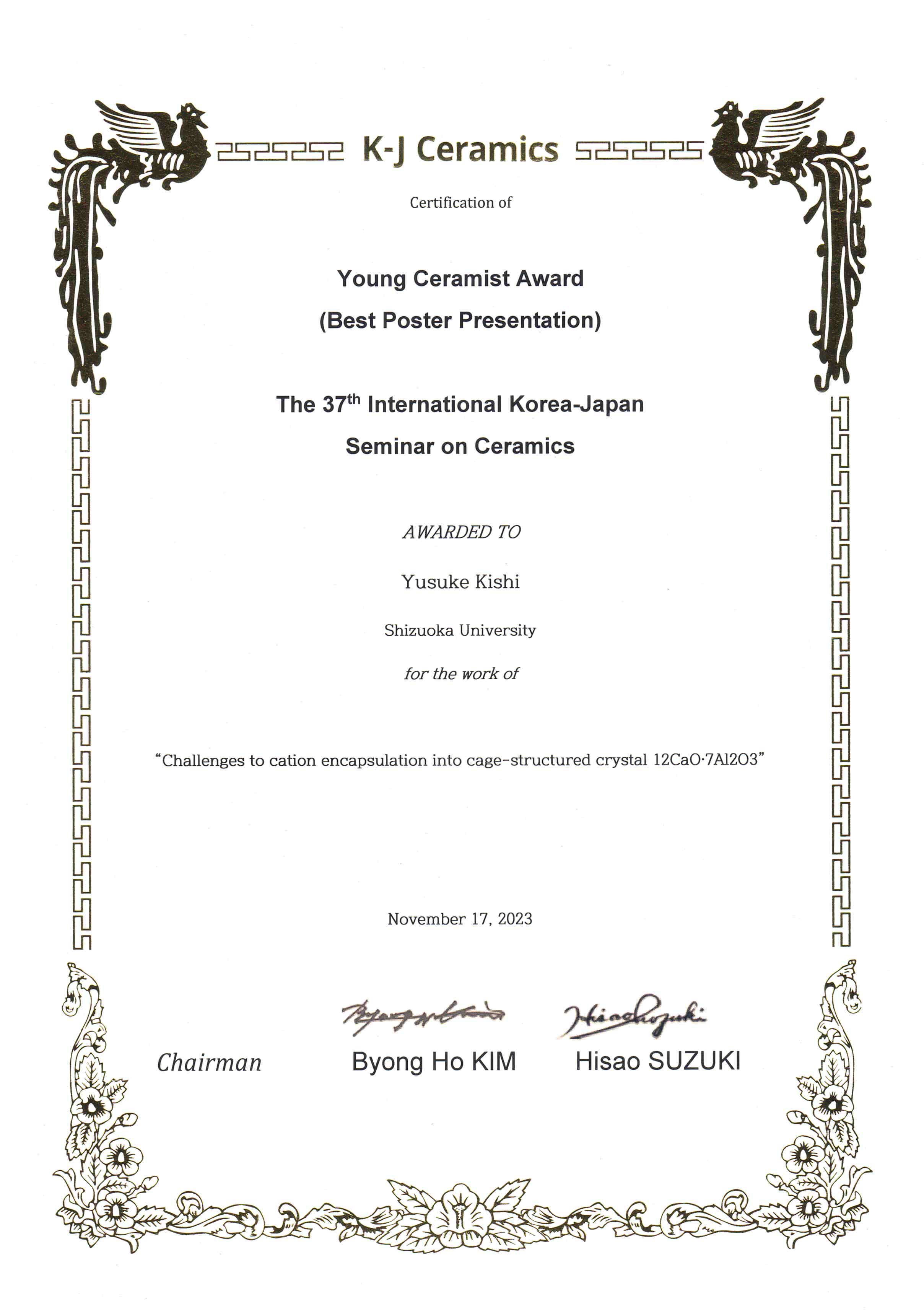 で開催されたThe 37th International Korea-Japan Seminar on Ceramics (KJ-Ceramics37)において、電子物質科学コースの脇谷坂元研究室から下記の学生が受賞しました。