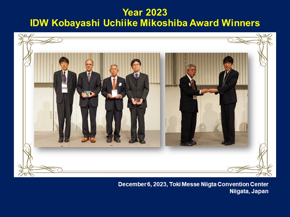 映像情報メディア学会が主催する第30回ディスプレイ国際ワークショップ(IDW23)が 12 ⽉ 6 ⽇から8日までの 3 ⽇間、朱鷺メッセ 新潟国際コンベンションセンターを会場に開催され、その初⽇に、中⻄洋⼀郎名誉教授がKUM 賞(Kobayashi-Uchiike-Mikoshiba Prize)を受賞しました。