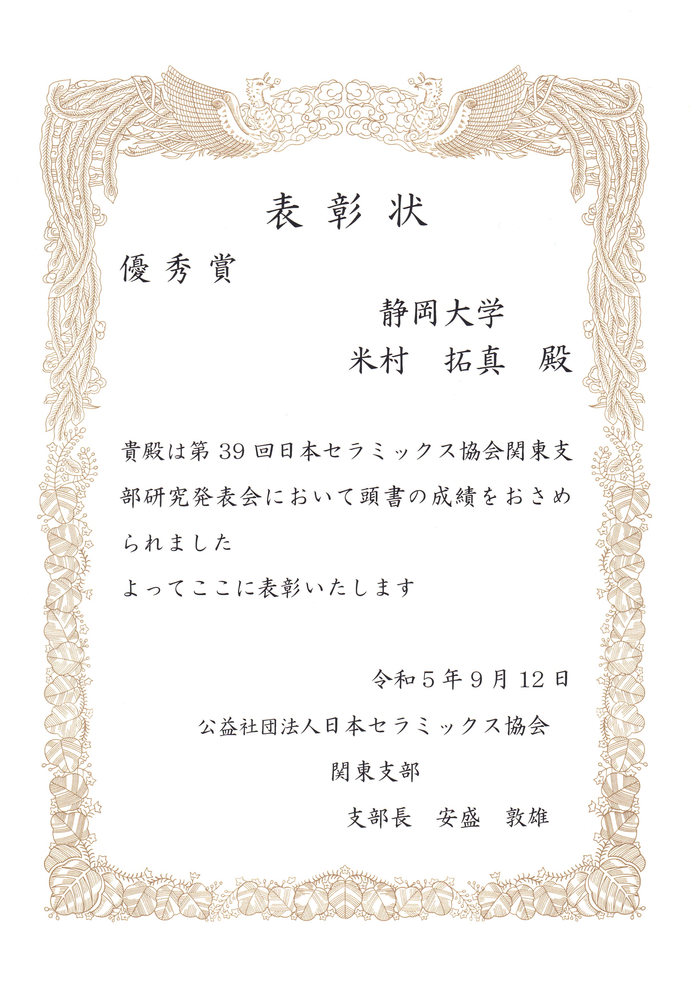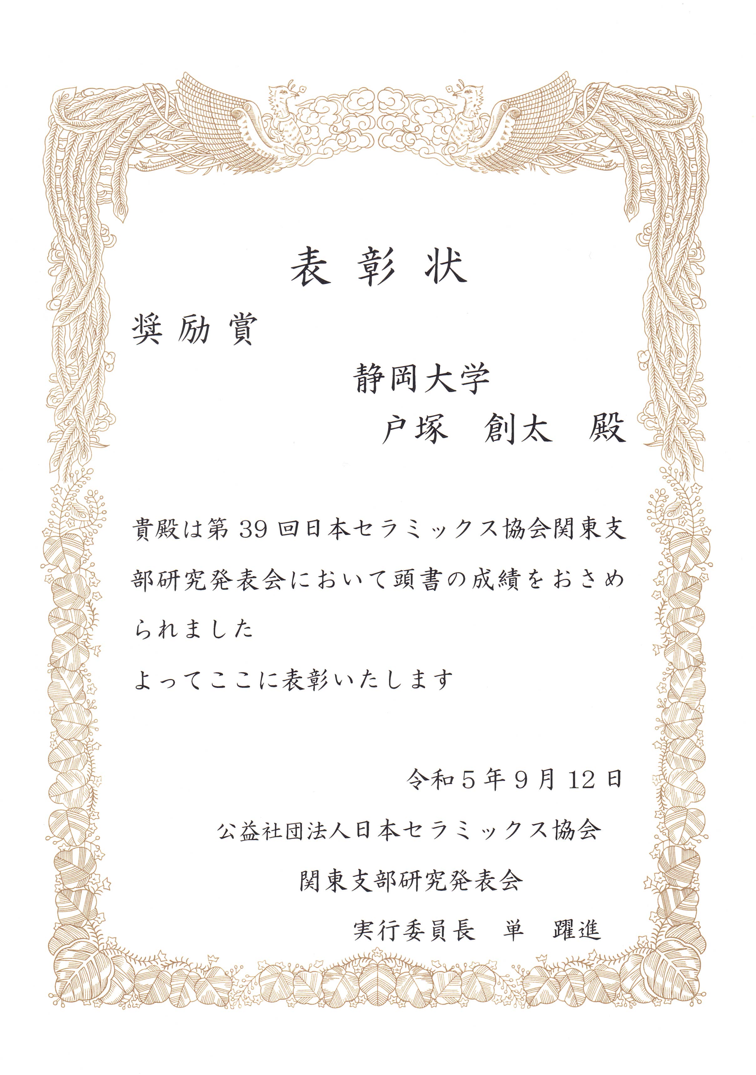 2023年9月11~12日に益子舘里山リゾートホテルで開催された第39回日本セラミックス協会関東支部研究発表会において、