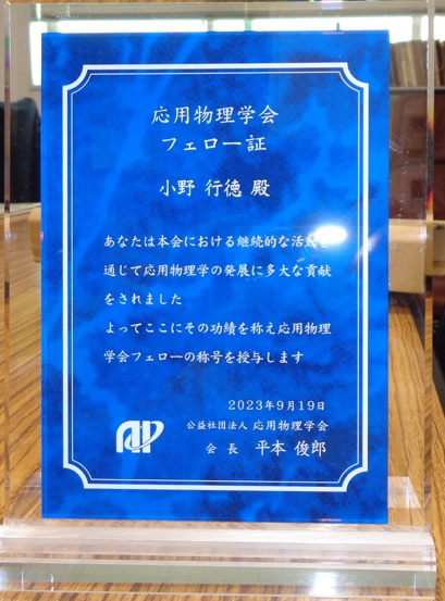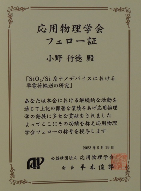 電子工学研究所の小野行徳教授(極限デバイス研究部門・ナノデバイス分野)が、応用物理学会から応用物理学の発展に顕著な貢献をしたとして、9月19日に第17回(2023年度)応用物理学会フェロー表彰式で表彰されました。