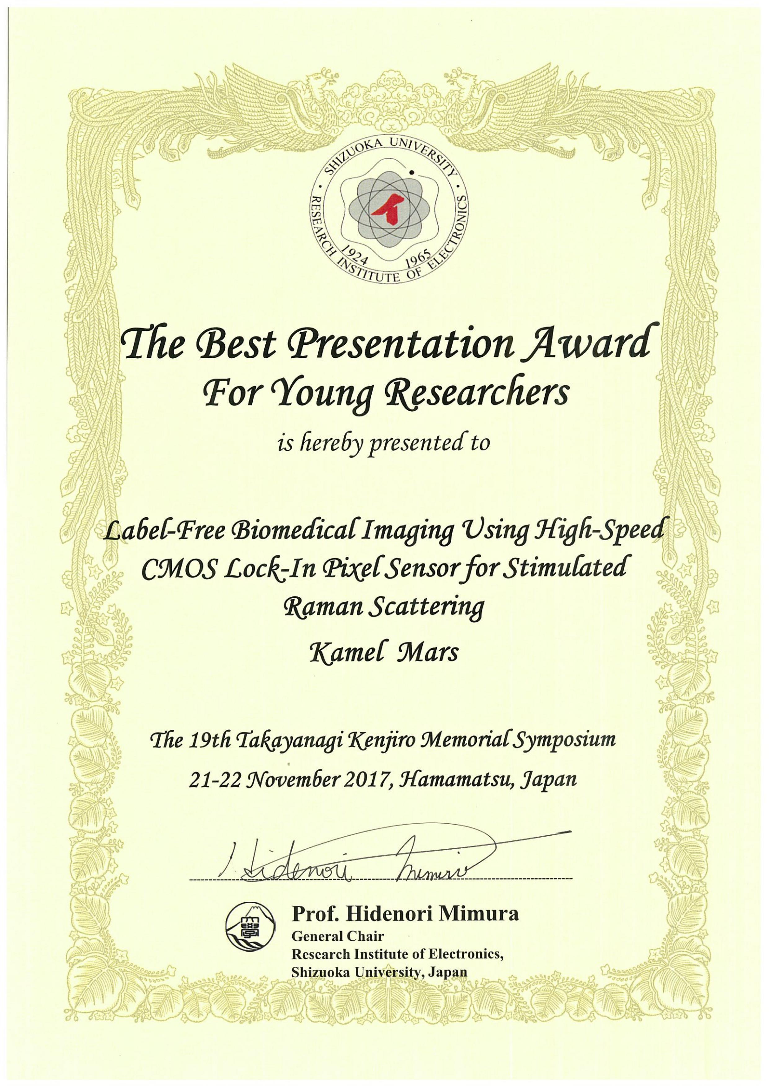 マース カメル特任助教(ナノビジョン研究部門、イメージングデバイス分野) が、The 19th Takayanagi Kenjiro Memorial SymposiumでThe Best Presentation Award For Young Researchers を受賞しました。