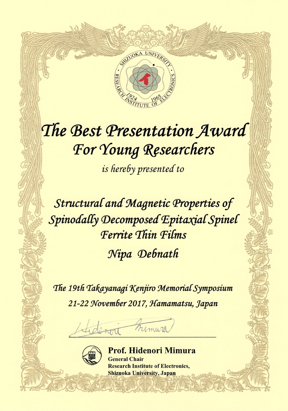 2017年11月21日(火)~11月22日(水)に開催された第19回 高柳健次 郎記念シンポジウムにおいて、創造科学技術大学院 光・ナノ物質機能専攻 鈴 木脇谷坂元研究室のデブナス・ニパさん(博士課程3年)がThe Best Presentation Award ForYoung Researchersを受賞しました。