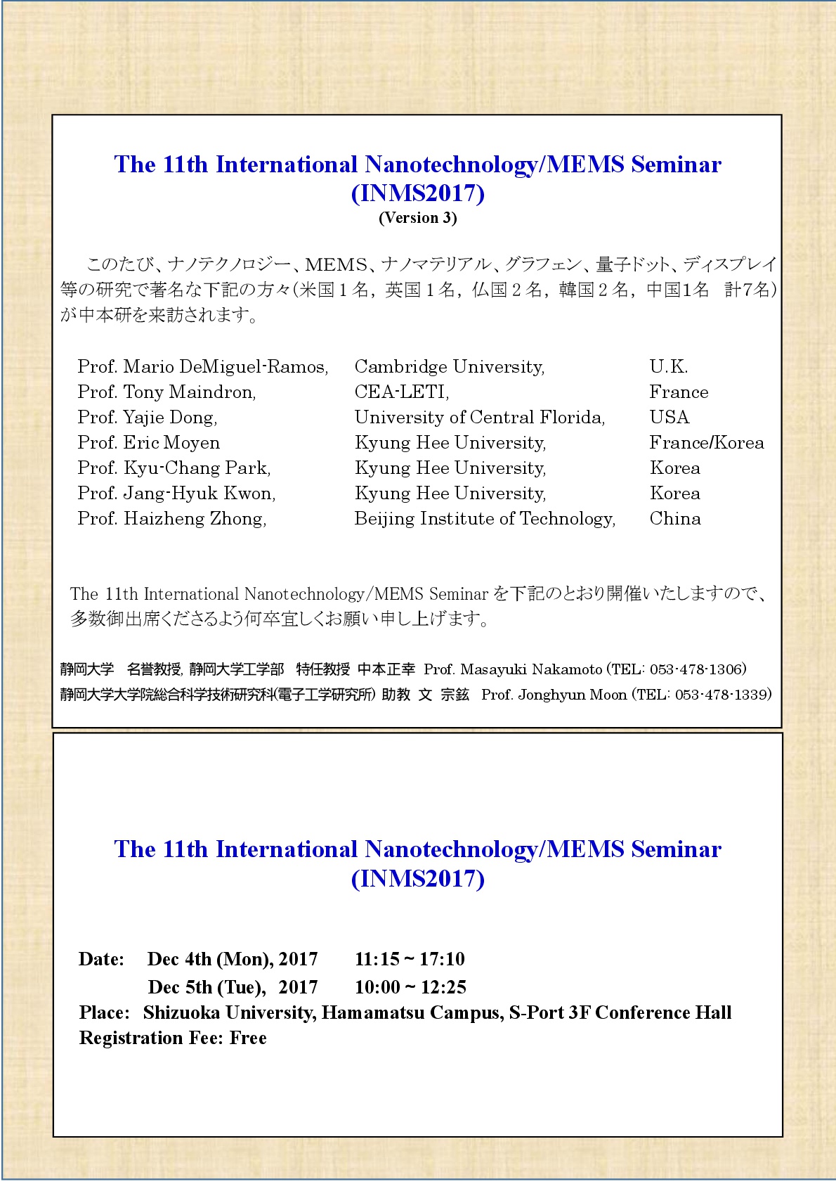 第11回目になります先端科学技術国際会議 The 11th International Nanotechnology/MEMS Seminar (INMS2017)を、12月4日(月)及び12月5日(火)に、静岡大学浜松キャンパスのS-Port 3階大会議室を、世界トップレベルのナノテクノロジー、MEMS、ナノマテリアル、グラフェン、量子ドット、ディスプレイ等の研究で著名な、海外の下記の方々(米国1名, 英国1名, 仏国2名, 韓国2名, 中国1名、計7名)を集めて、開催致します。