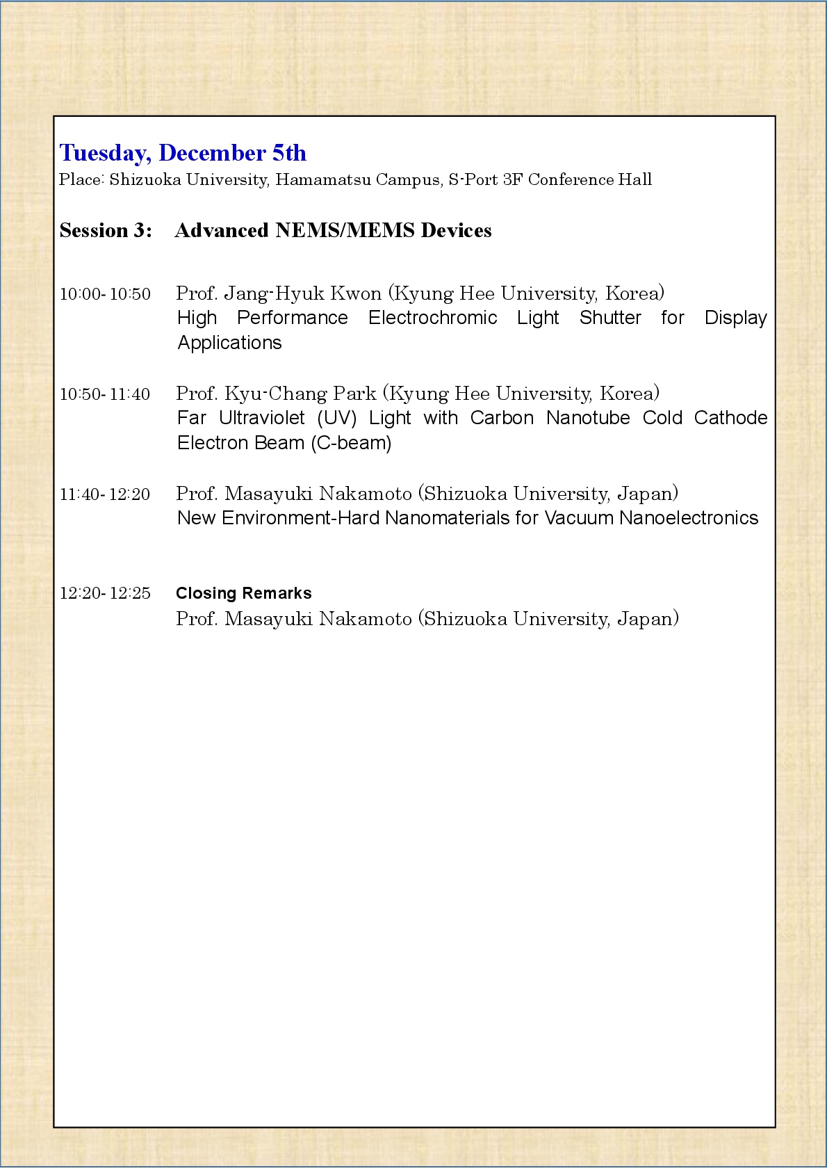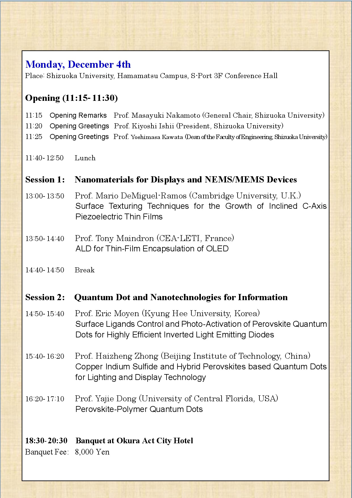 本年は、ナノテクノロジー及びナノマテリアルの世界的権威であるケンブリッジ大学副学長・理事、先端光電子工学研究所所長Prof. William I. Milneの研究グループのProf. Mario DeMiguel-Ramos,ナノテクノロジーに関する世界有数の規模を持つCEA-LETI(フランス国立電子情報技術研究所)のProf. Tony Maindron、韓国ディスプレイ学会会長のProf. Jin Jangが設立したKyung-Hee大学先端ディスプレイ研究所のProf. Eric Moyen、Prof. Kyu-Chang Park及びProf. Jang-Hyuk Kwon、また、北京理工大学のProf. Haizheng Zhong、University of Central FloridaのProf.Y. Dongに、招待講演をお願いしております。