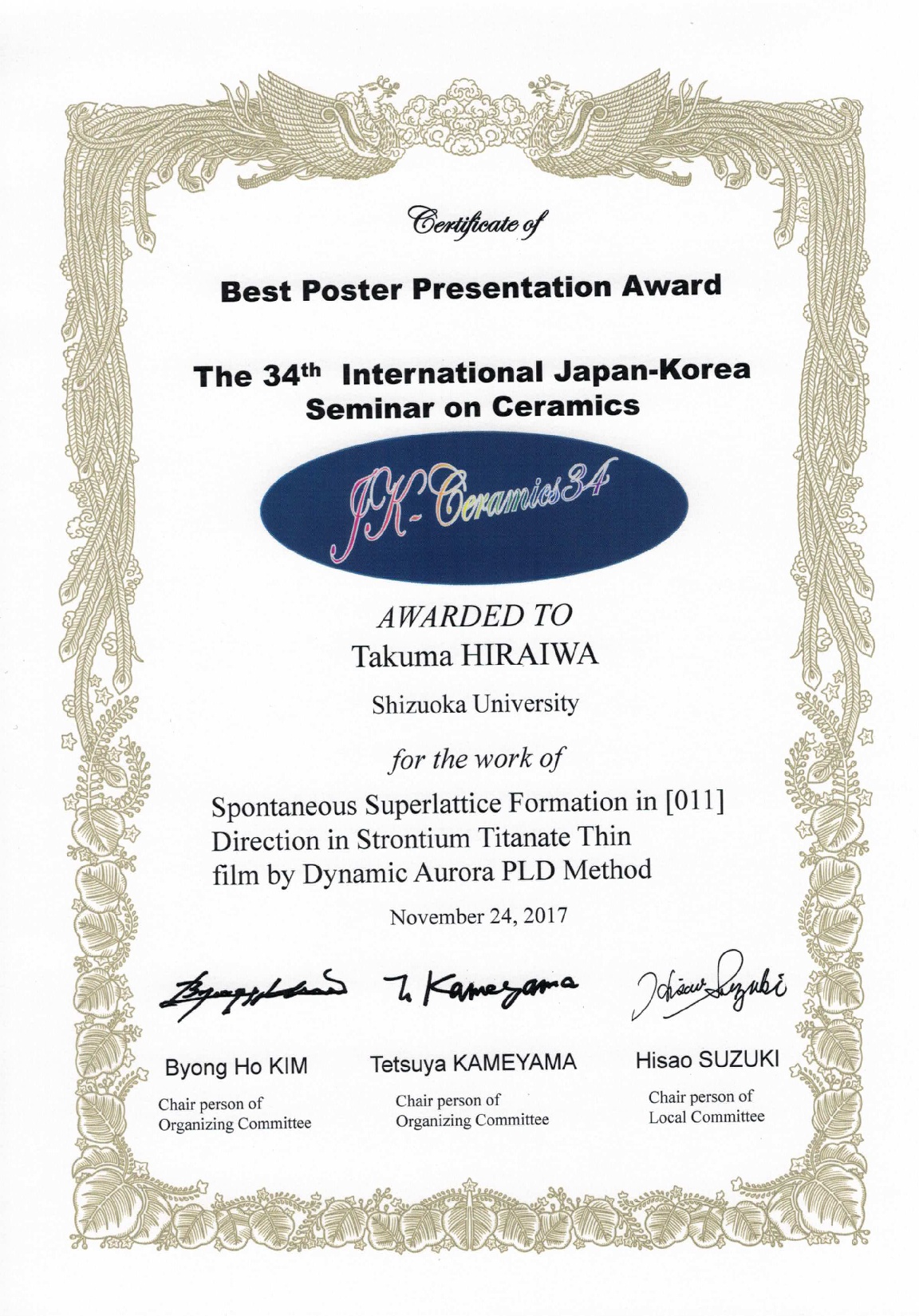 The 34th International Japan-Korea Seminar on Ceramicsにおいて、工学専攻電子物質科学コースの鈴木脇谷坂元研究室の平岩卓磨君(修士1年)がBest Poster Presentation Awardを受賞しました。