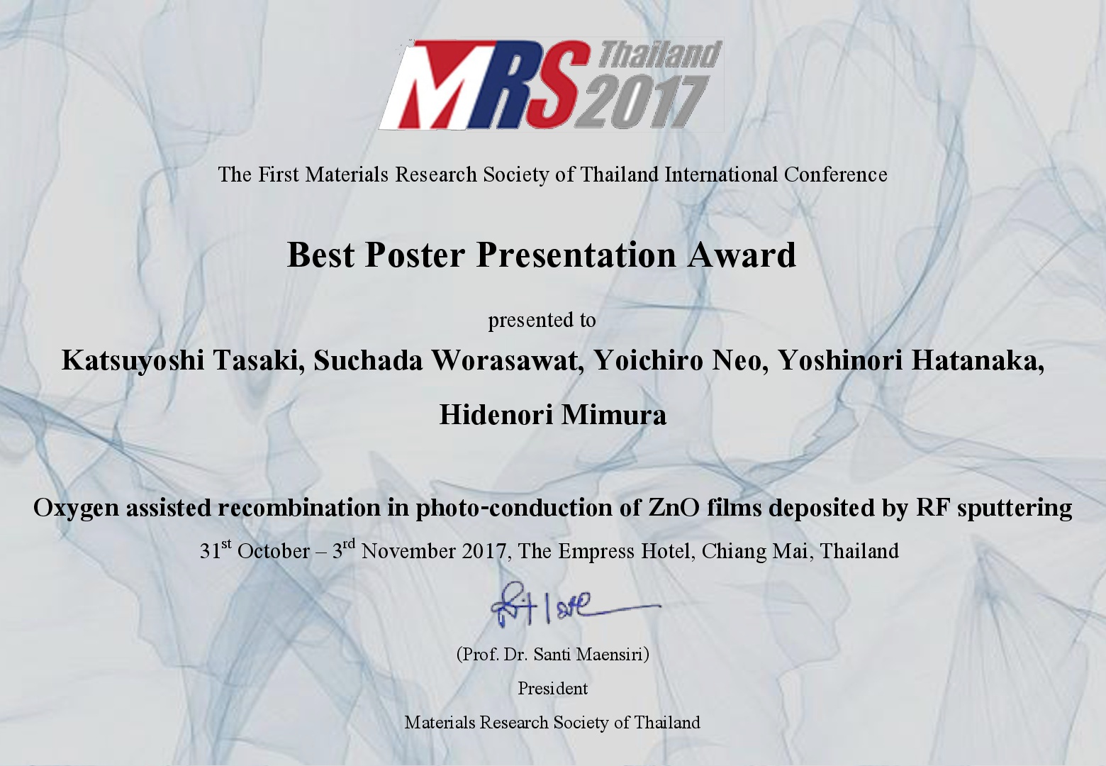 三村研、田崎克佳さん(修士1年生)が第一回Material Research Society(MRS)タイランド国際会議2017でBest Poster Presentation Award を受賞。