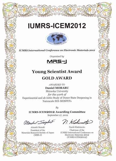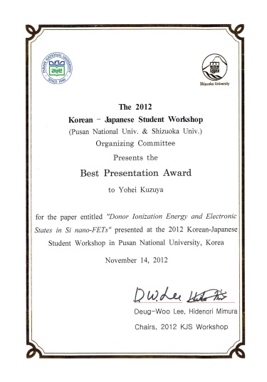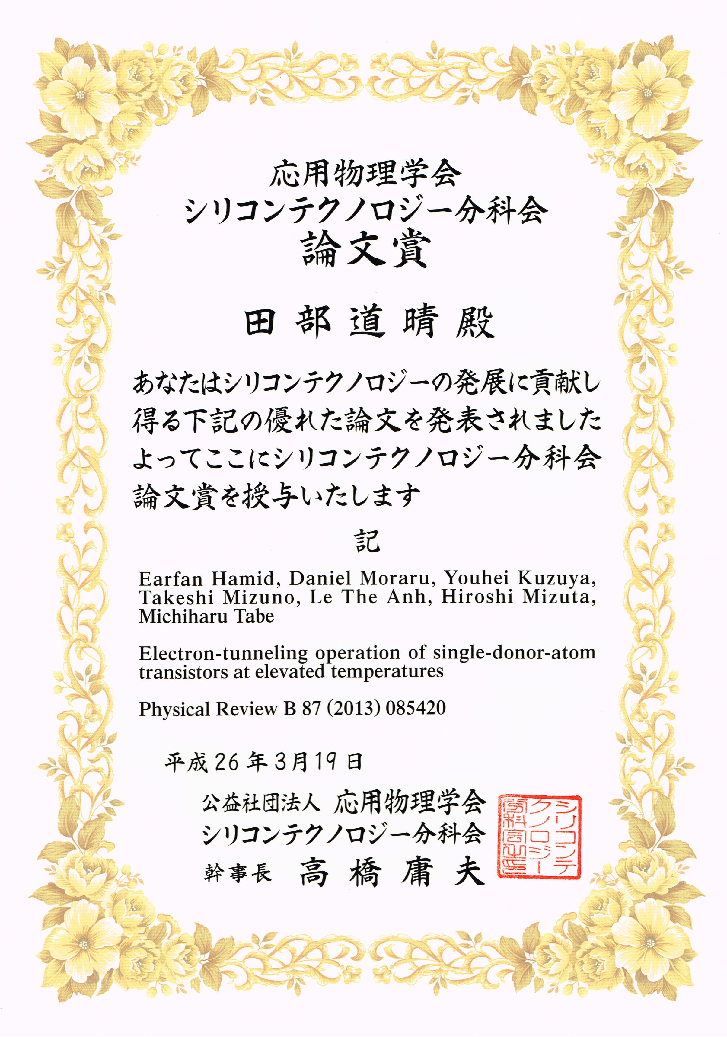 第5回応用物理学会シリコンテクノロジー分科会「論文賞」受賞 Earfan Hamid, Daniel Moraru, Youhei Kuzuya, Takeshi Mizuno, Le The Anh, Hiroshi Mizuta, Michiharu Tabe “Electron-tunneling operation of single-donor-atom transistors at elevated temperatures” Physical Review B, Vol. 87, Issue 8, pp. 085420-1-5 |