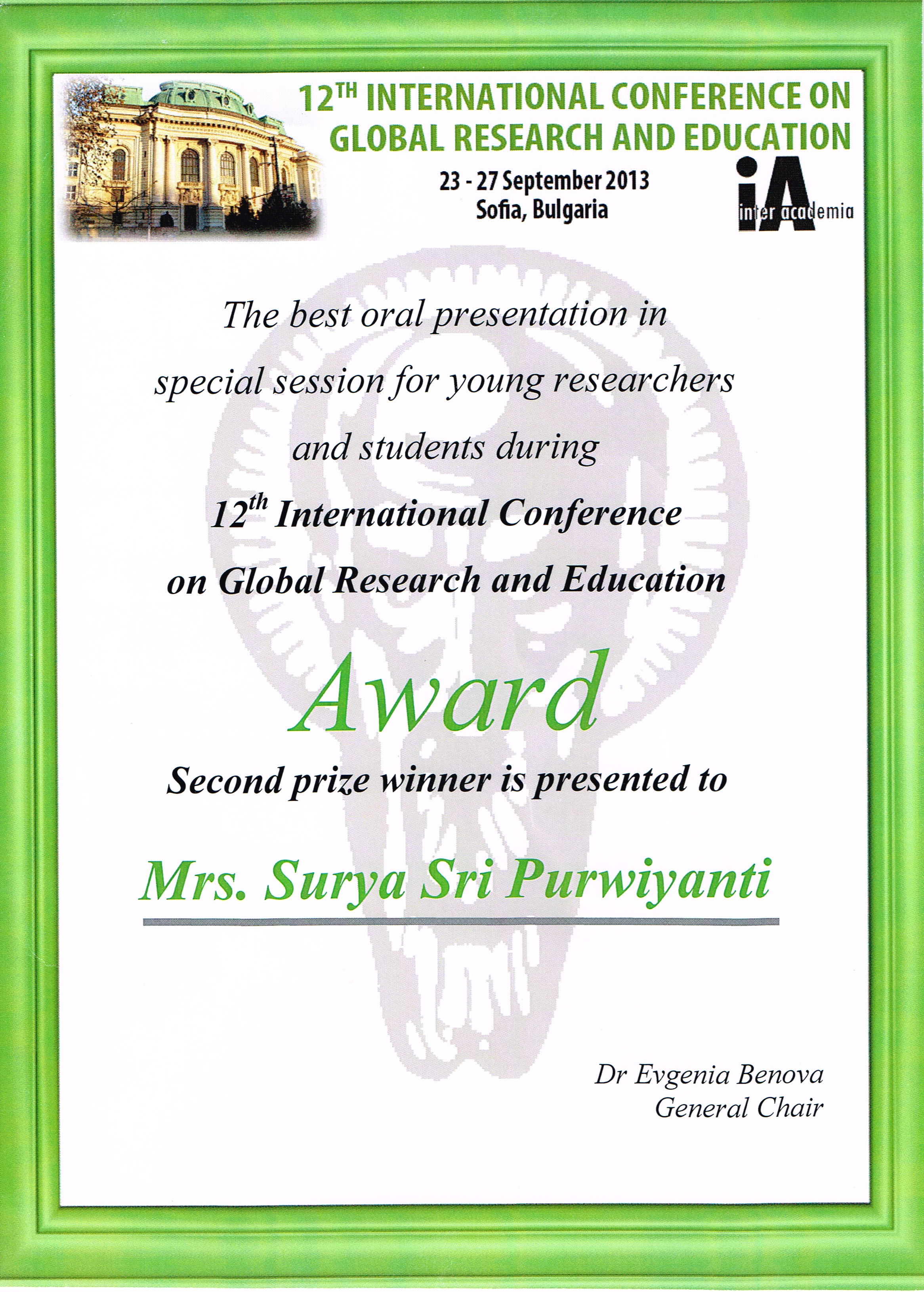「12th inter-Acedemia, Best Oral Presentation Award」受賞