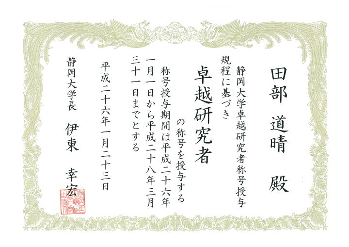 田部道晴:静岡大学 卓越研究者の称号を授与されました |