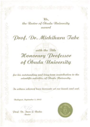 オブダ大学(ハンガリー)より名誉教授の称号を授与されました。 |