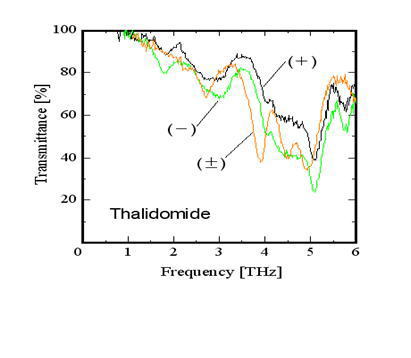 サリドマイドのテラヘルツ分光吸収スペクトルを示します。薬として効く構造のサリドマイドが(+)で示されています。(±)は、薬として効く構造と有害な構造を等量混ぜたものです。このふたつはすっかり異なるスペクトルを示しますので、これを利用して有害成分の混入を容易に見つけることができます。 |